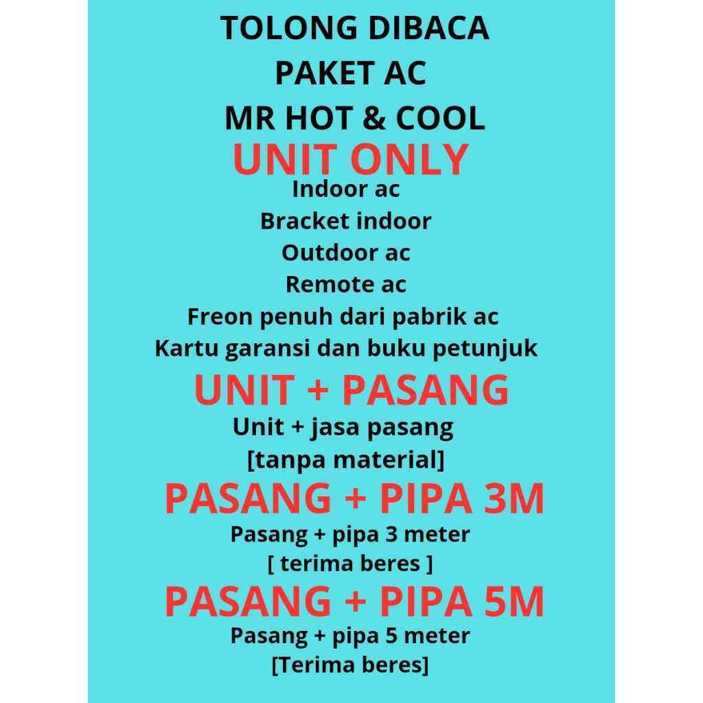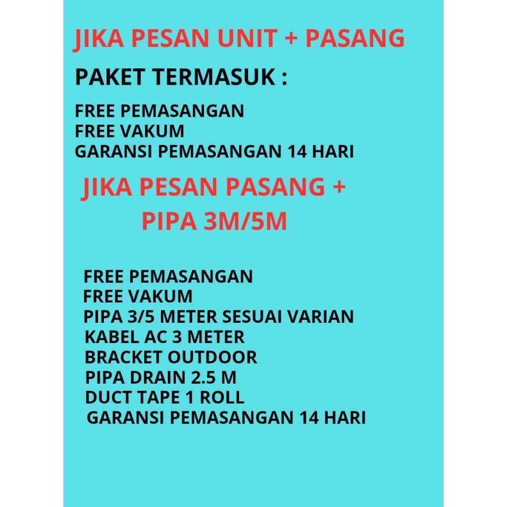 UNIT ONLY, UNIT + PASANG, PASANG PIPA 3M, PASANG PIPA 5M, PASANG PIPA 6M, PASANG PIPA 7M, PASANG PIPA 8M, PASANG PIPA 9M, PASANG PIPA 10M