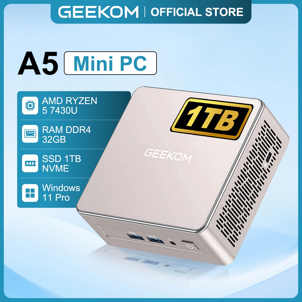 GEEKOM A5 2025 Ed Mini PC with AMD R5 7430U, 32GB RAM & 1TB M.2 NVMe SSD, Support 8K UHD 4 Display