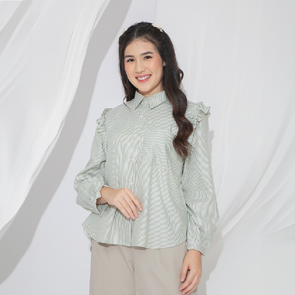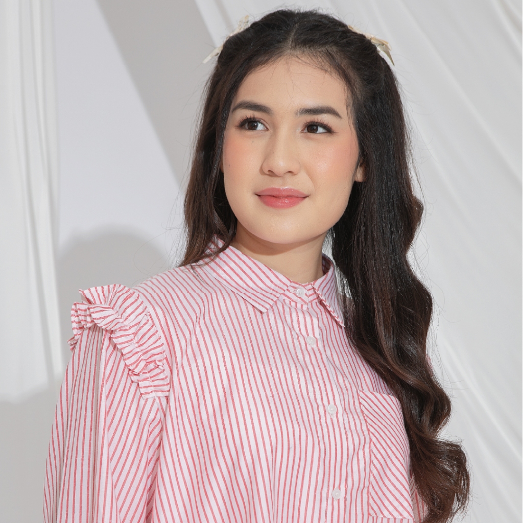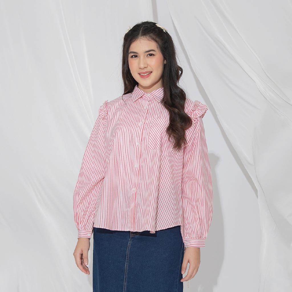 HijabChic Agista Stripe Top - Kemeja Muslim Ruffle Lengan Pof Terbaru