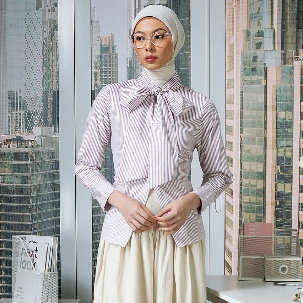 HijabChic Celva Top - Kemeja Stripe Cotton Kerah Tali Timeless