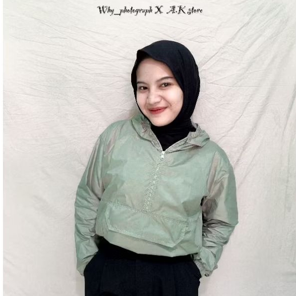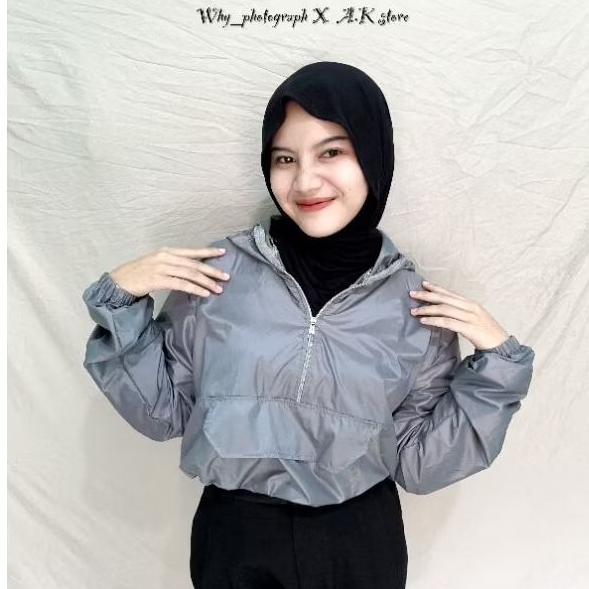 Jaket Olahraga Crop Wanita Parasut Dengan Saku Depan Atasan Sport Cewek