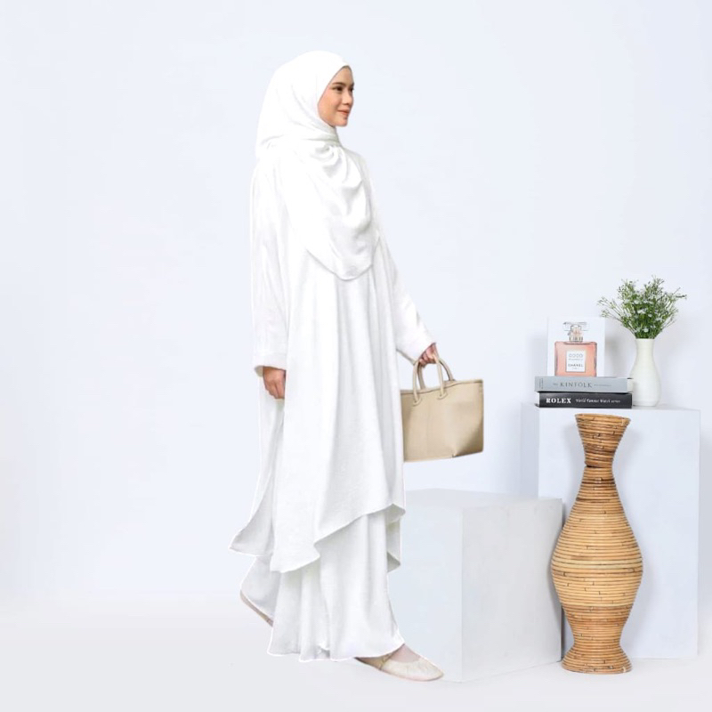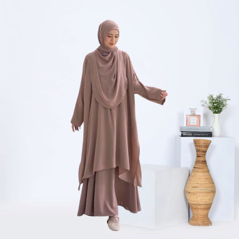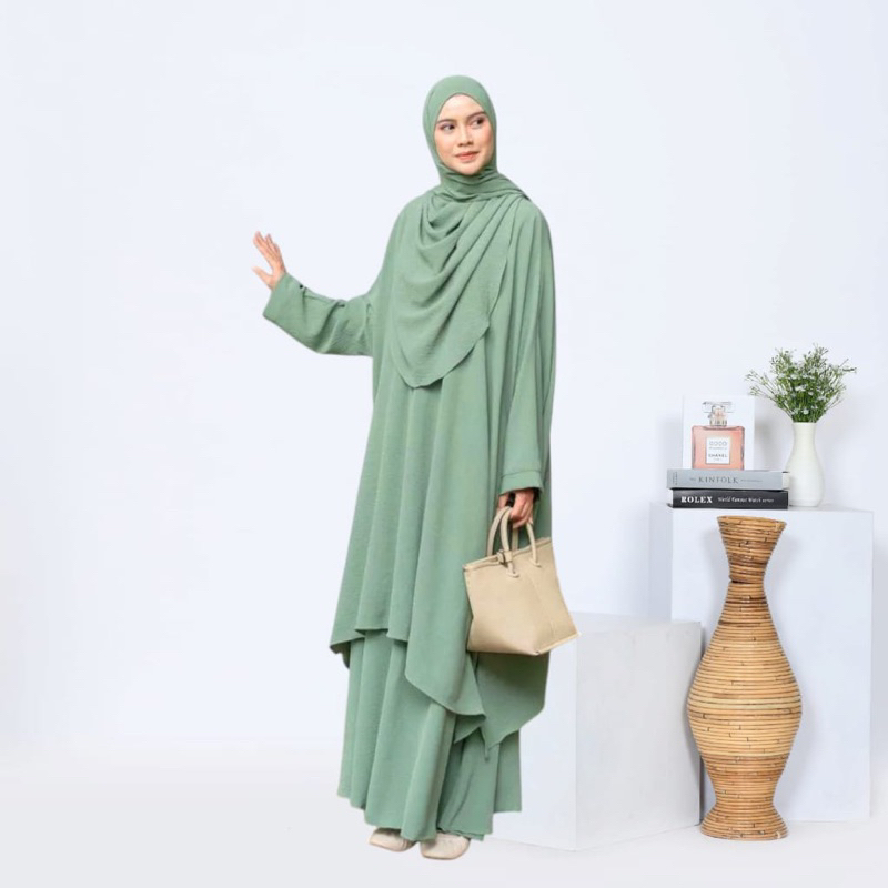 One Set Rok Tunik Melayu Syari Pashmina Oval Setelan Abaya Wanita Set Hijab Crinkle Airflow Premium