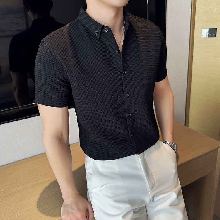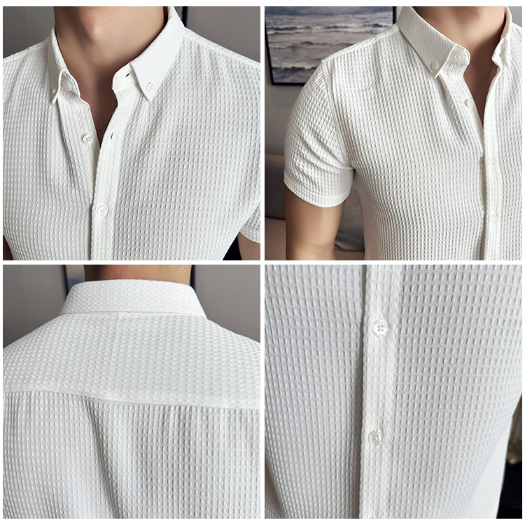 Kemeja Pria Waffle Knit Baju Atasan Pria Lengan Pendek Motif Polos Slimfit warna coklat korean style