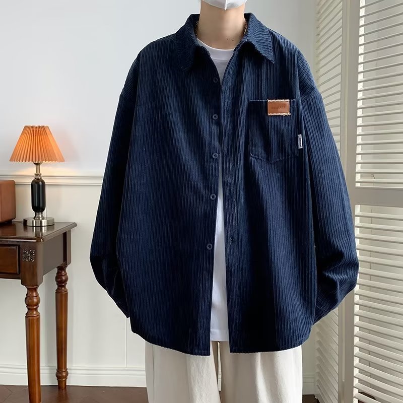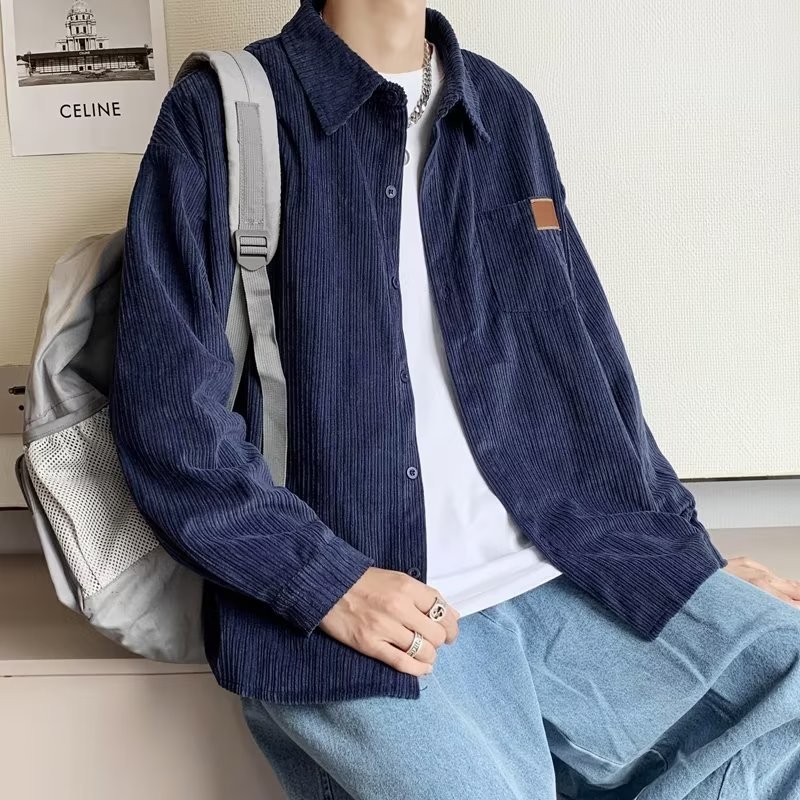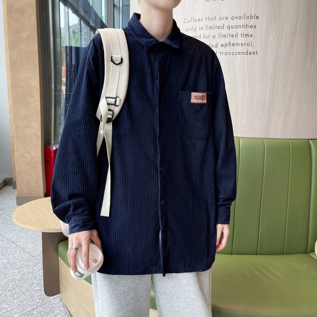 Corduroy Harajuku Retro Colour Casual Long Sleeve Outer Shirt in Navy Blue Color - Kemeja Blue Biru Navy Biru Dongker /
