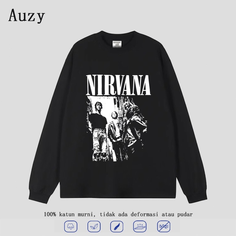 AUZY American retro Style lengan panjang Oversize band Print top| Lengan panjang pria Wanita Hitam | Baju atasan pria