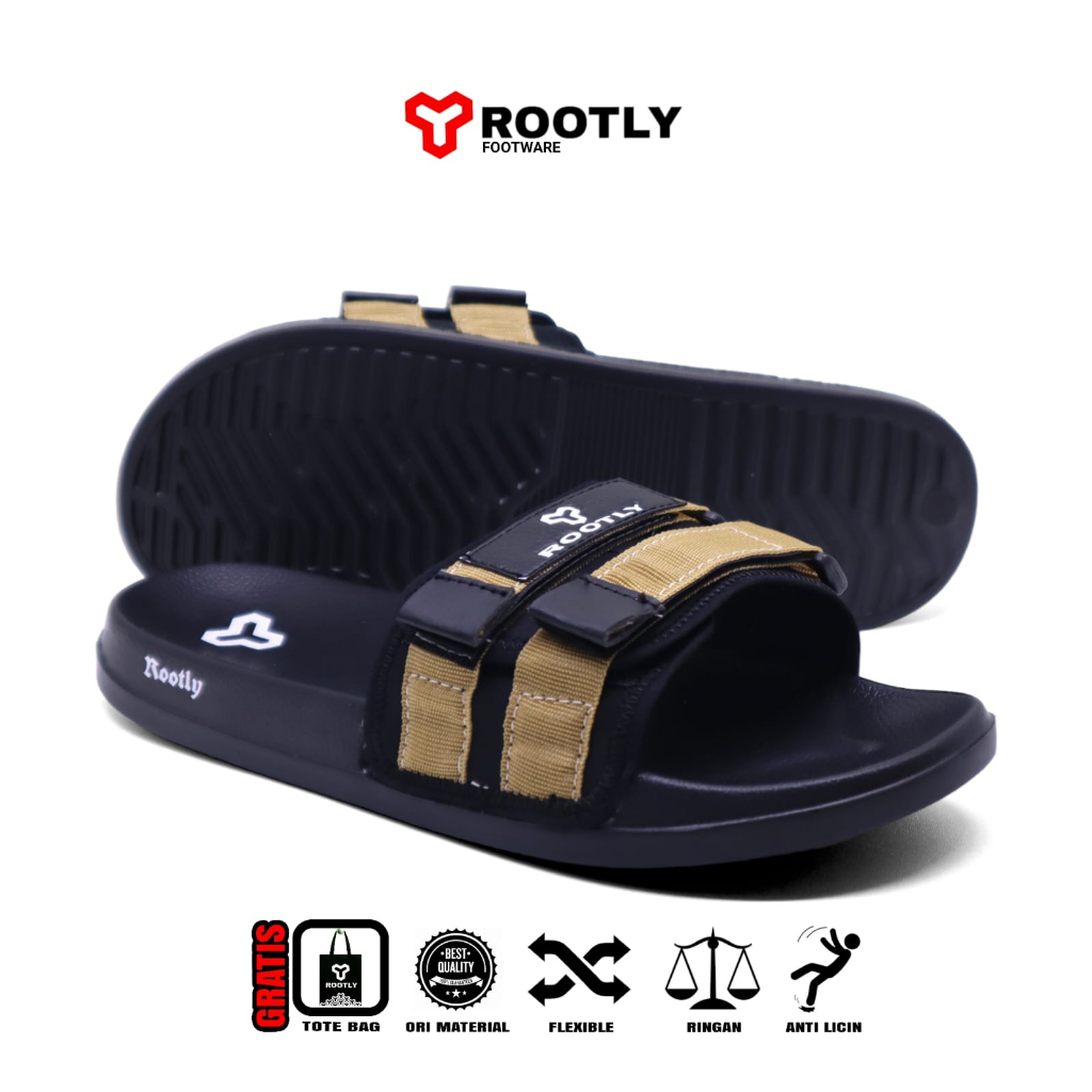 Sandal Slop Pria Rootly Sandal Slide Cowok Terbaru Velcro Cokelat Hits Kekinian