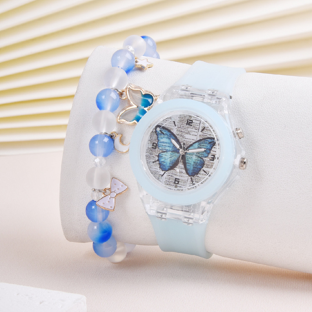 Jam Tangan Anak 2Pcs Kuarsa Lucu Menyala Kupu Kupu Led Silikon Tahan Air Dengan Gelang Manik-Manik