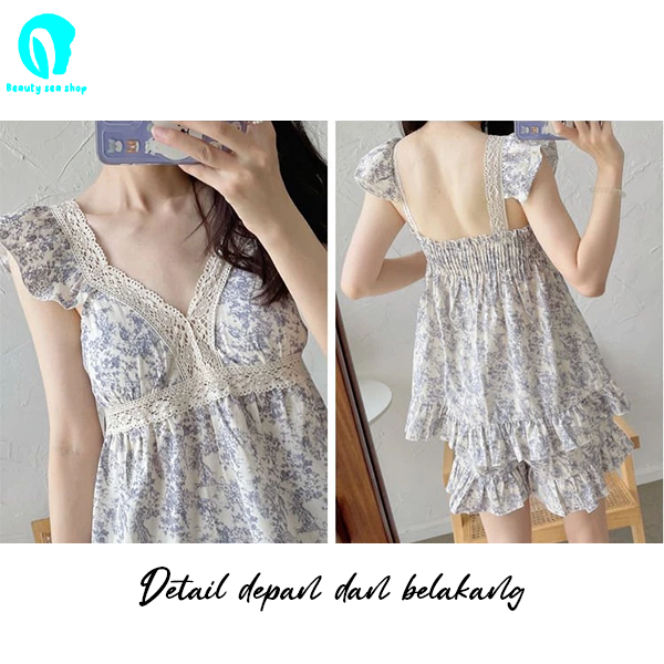 BTS DQ996 Piiyama Set Tanktop Vintage Ruffle With Lace Dengan Bantalan Dada /Set Baju tidur wanita Tanktop dengan Motif