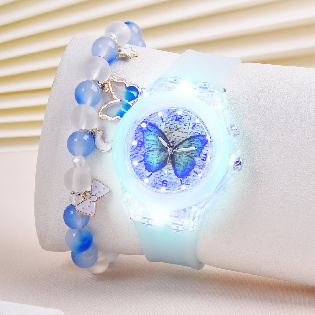 Jam Tangan Kuarsa Anak 2Pcs Kartun Kupu Kupu Led Silikon Tahan Air Dengan Gelang Manik-Manik