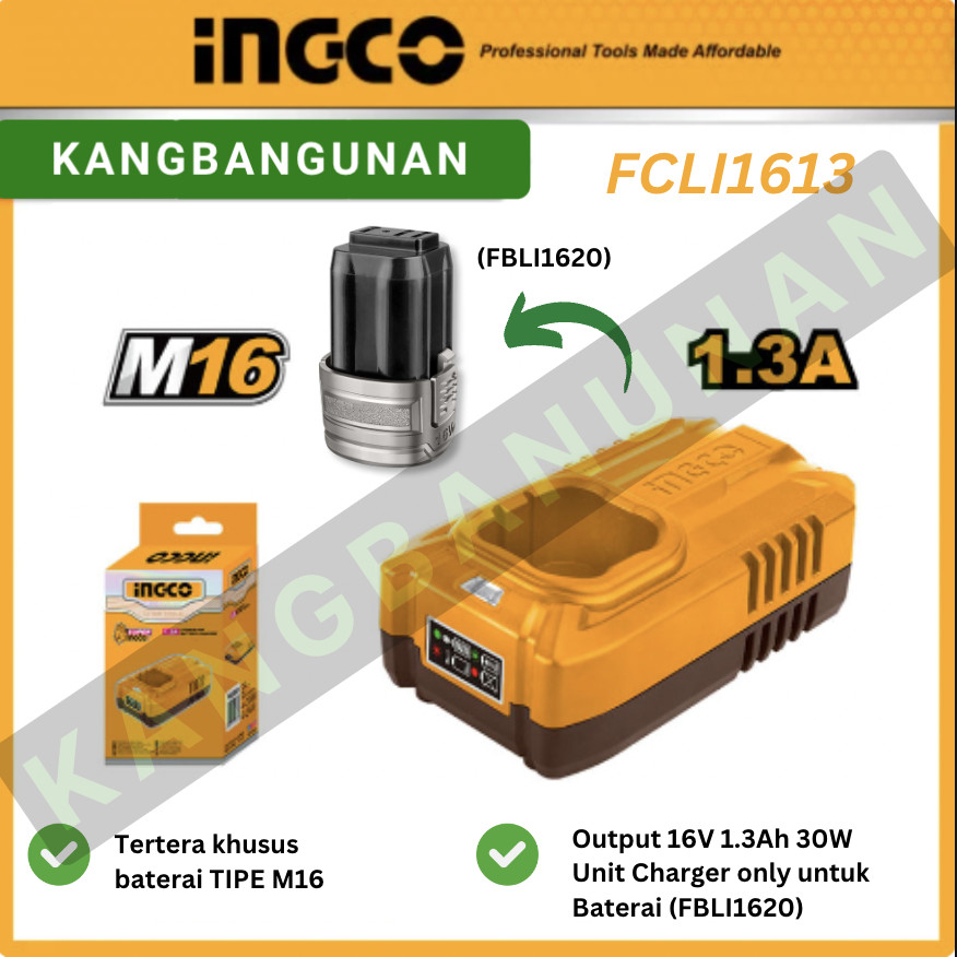 FCLI1613 FAST CHARGER BATERAI LITHIUM CORDLESS BATTERY 16V M16 INGCO Fast Charger 16V Battery 1.3A INGCO FCLI1613 Casan Baterai Cordless Share M16