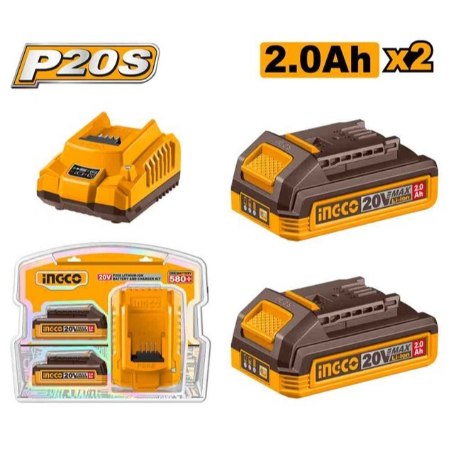 PAKET 3 in 1 Baterai 2.0Ah 20V Fast Charger 2A INGCO FBCPK2212 Battery Cordless 2Ah P20S