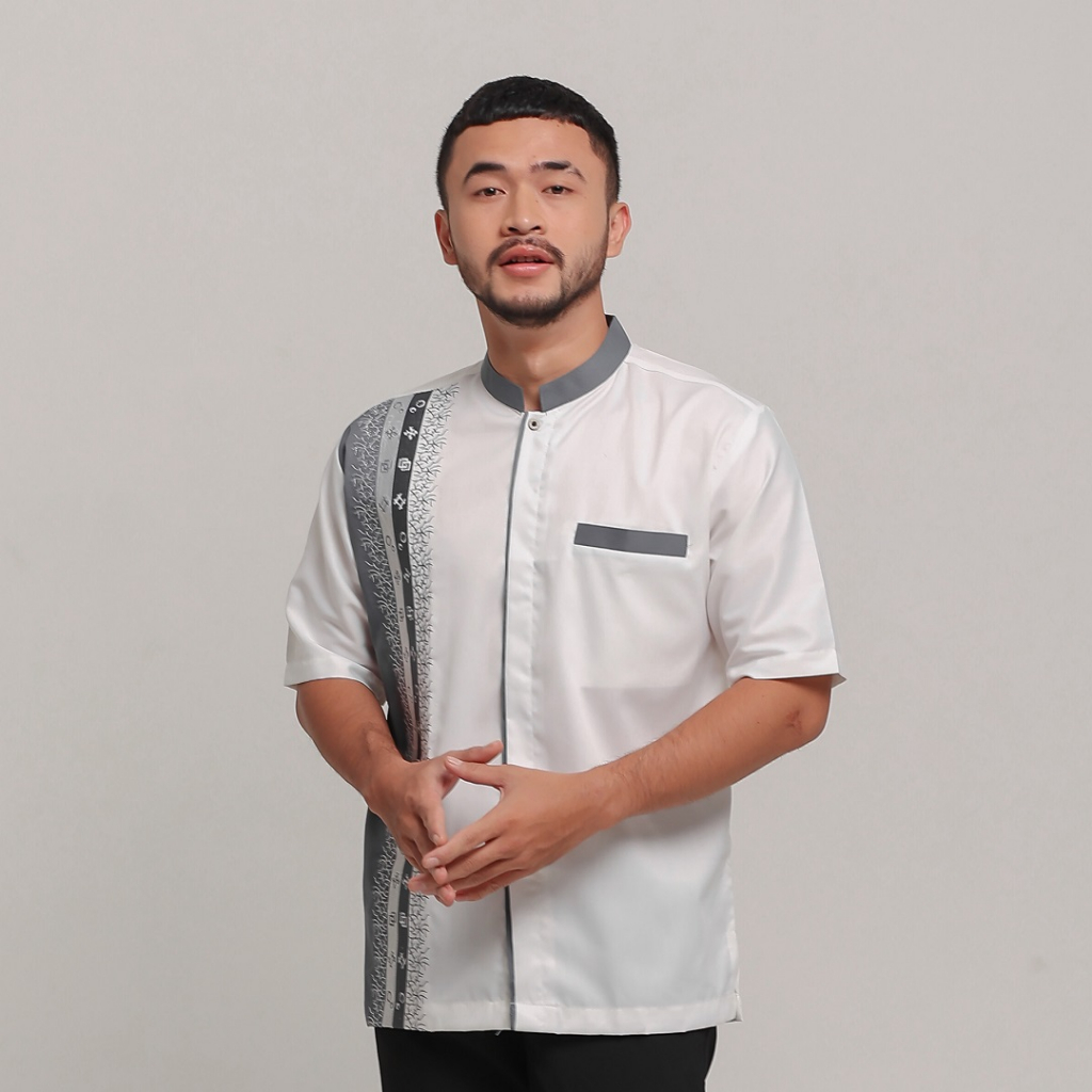 Baju Koko Muslim Pria Lengan Pendek Putih Tulang Katun Toyobo Bordir Tasikmalaya Alkinan Akt050