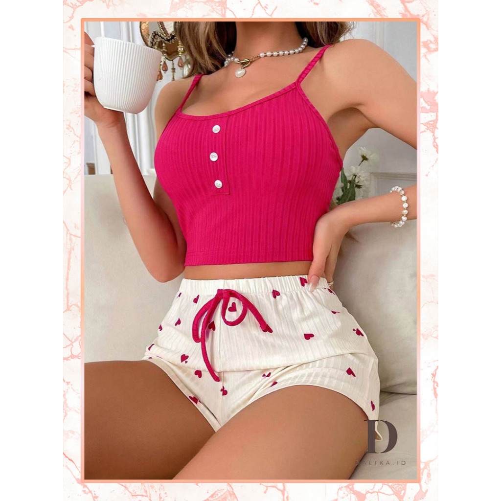 Piyama Baju Tidur Wanita Baju Santai Sleepwear Setelan Tank Top Simple Pink motif Hati Celana Pendek Hotpants Homewear S