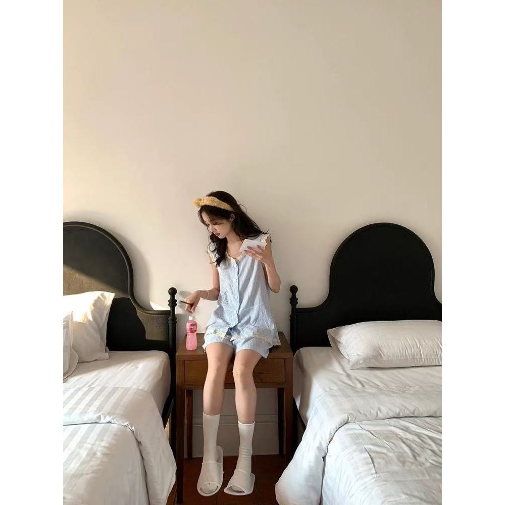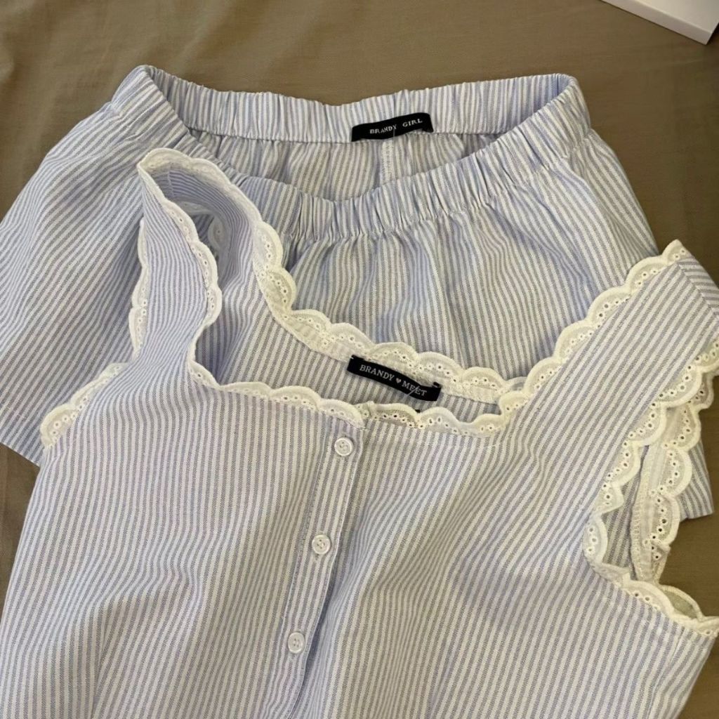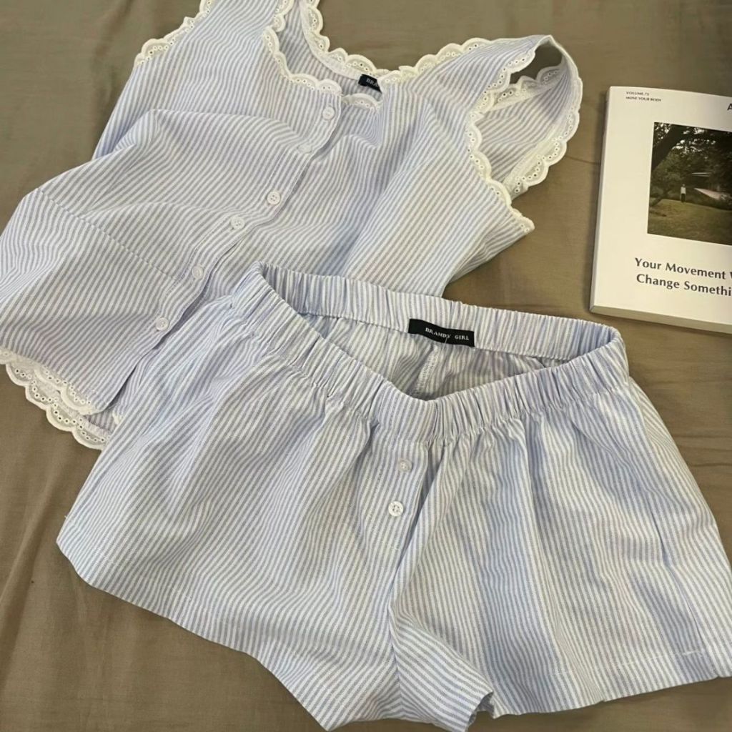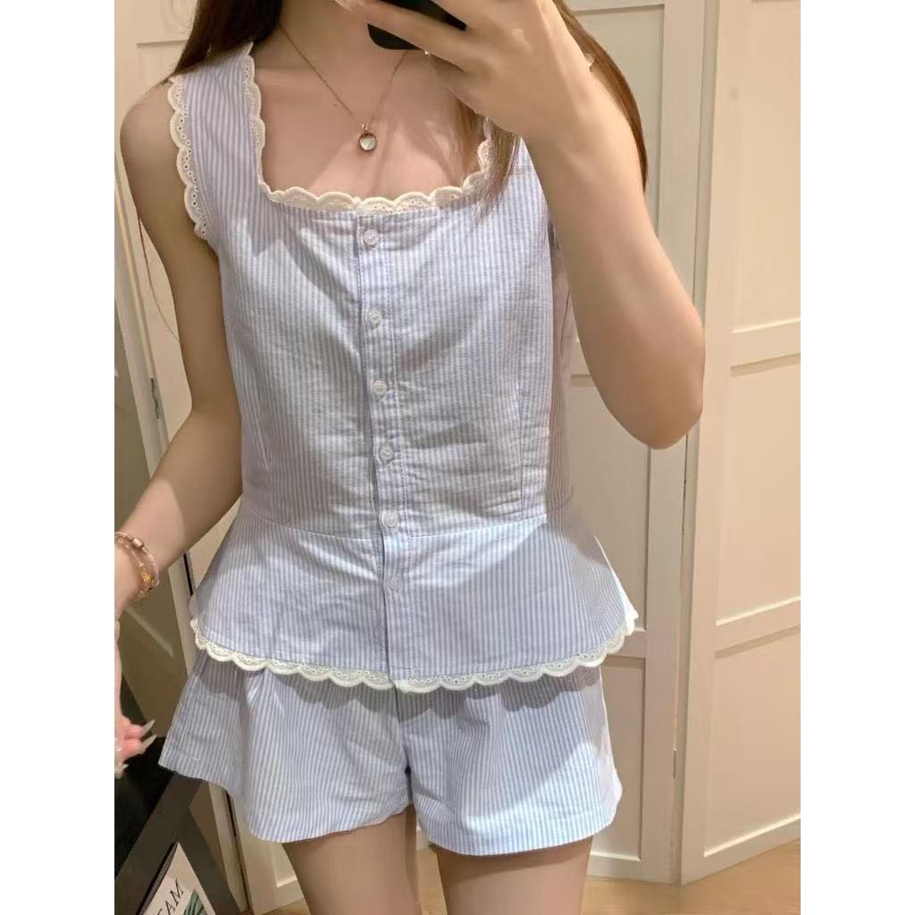 Set Piyama Rompi Bergaris Biru/Pakaian Rumah/Kaos Tanpa Lengan U Neck Lace Wanita+Celana Pendek