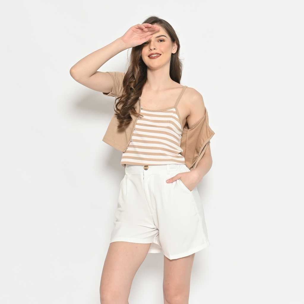 QUEENTIN Tanktop Cardigan Wanita Crop Set 0680 Stretch Yeona Knit Polos Salur Lengan Pendek