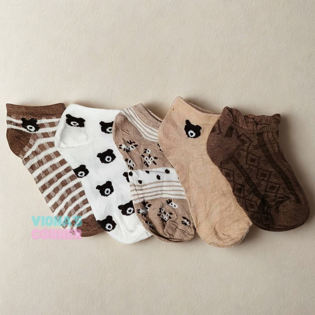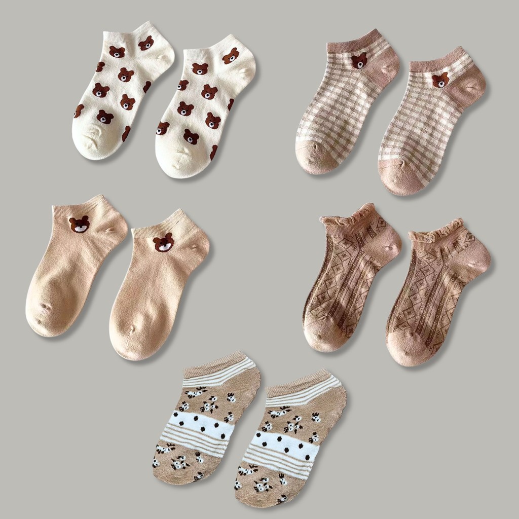 Kaos Kaki Wanita Pendek Paket 5 Pasang Lucu Motif Bear Korean Aesthetic