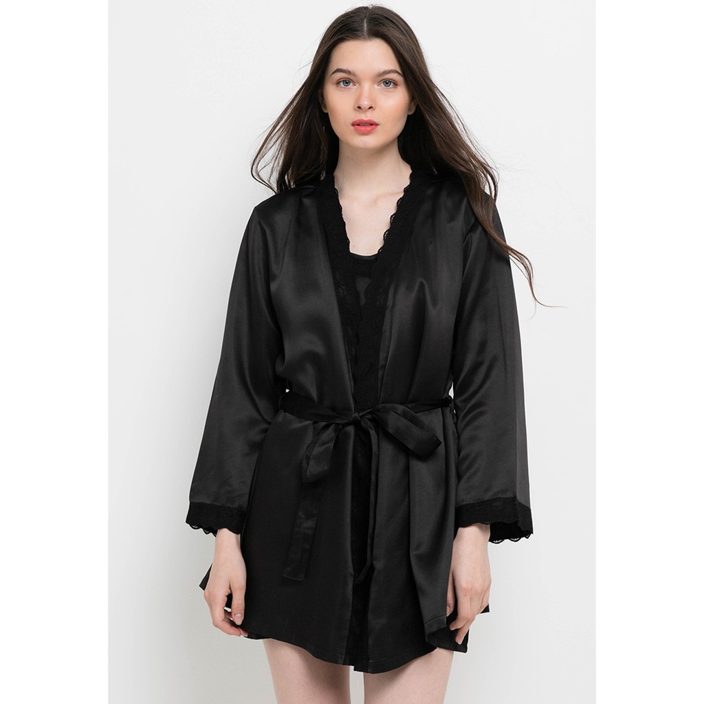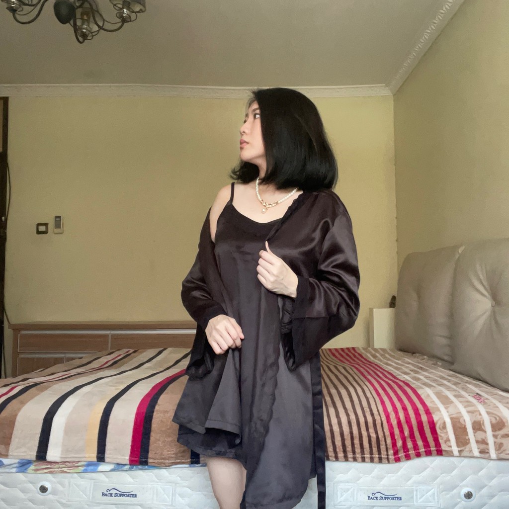 Baju Tidur Wanita Tanktop dan Kimono Satin Anne Wintours Hitam A2101 71171 Kado Gift Renda Polos