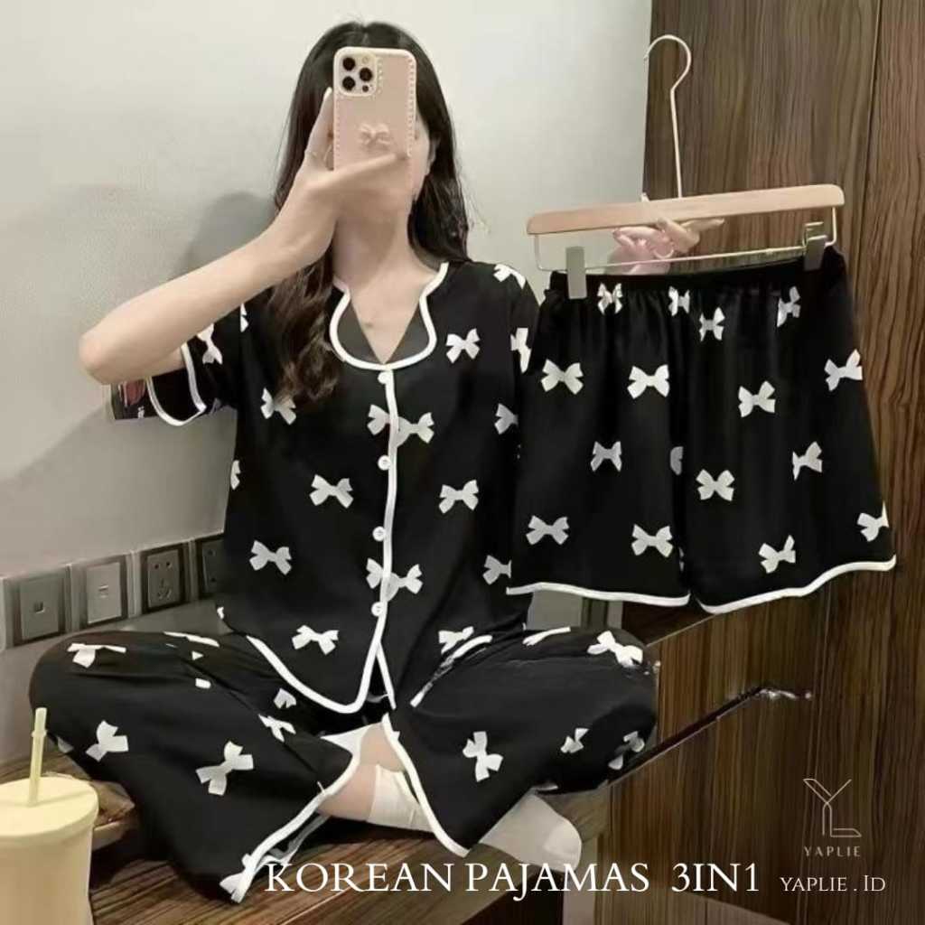 YapLie 3KE01 Baju Tidur Piyama Wanita Set 3in1 | Setelan 1 Baju 2 Celana l Adem Nyaman