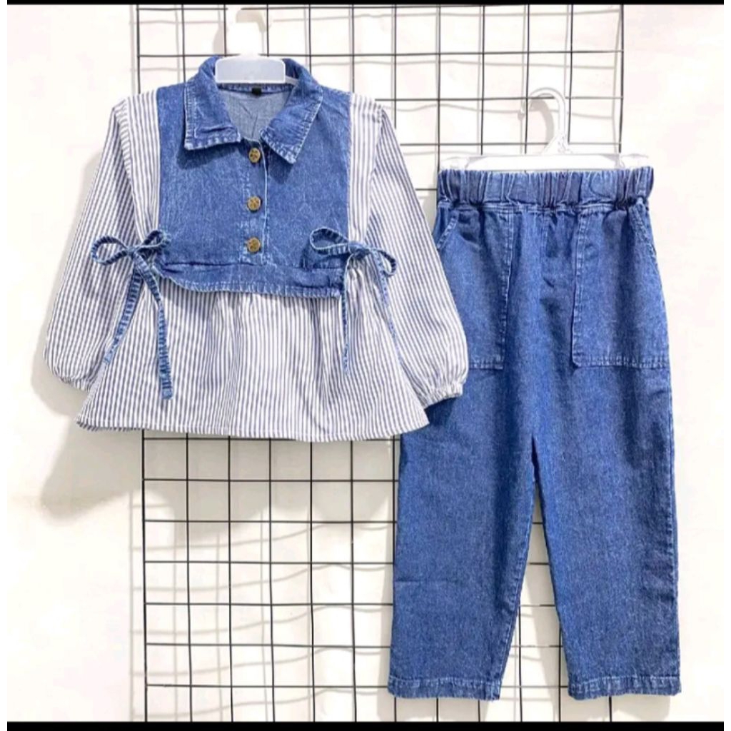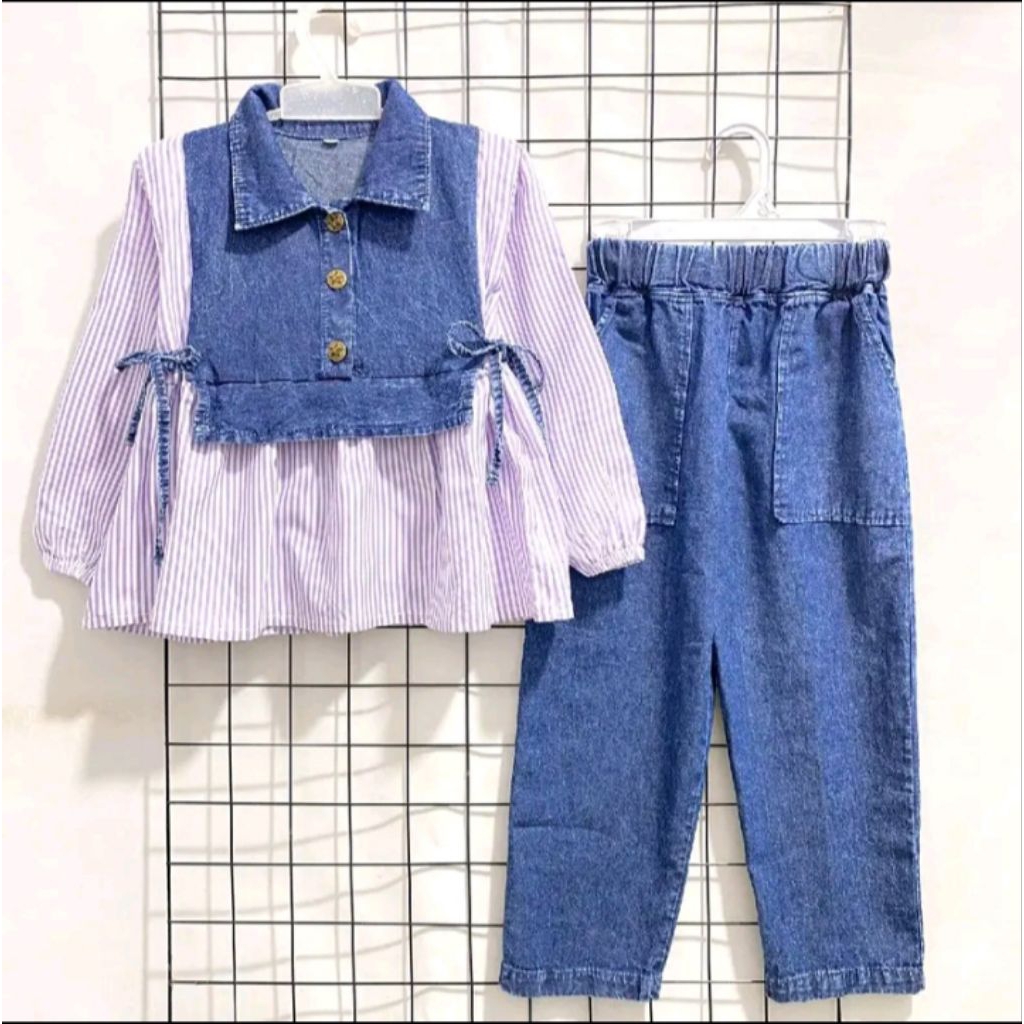 Baju Setelan Anak Kemeja Motif Salur & Jeans Anak 2-11 Tahun Aruna Oneset Jeans Anak Kekinian Fashion Anak