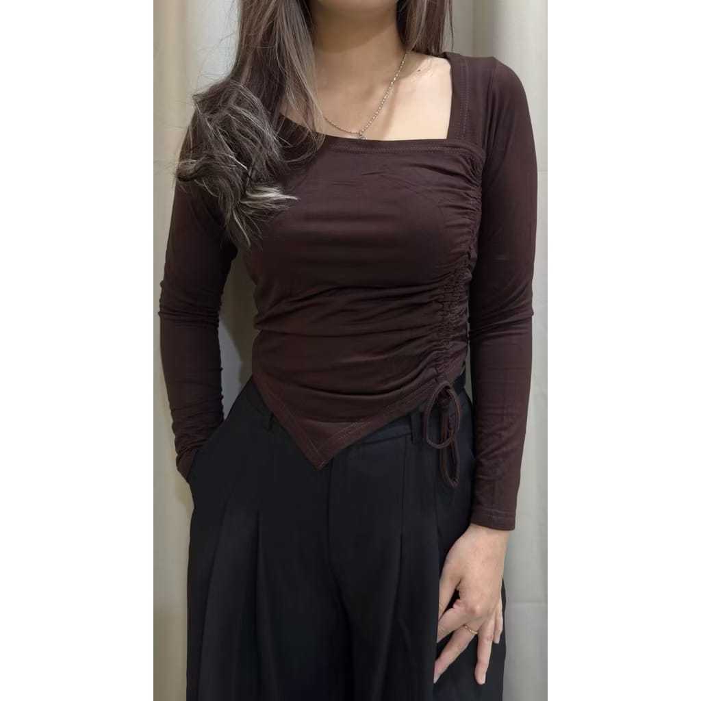 Baju Crop Top Korean Style Lisz Fashion Kaos Wanita Square Neck Tali Serut Samping Lengan Panjang 6057