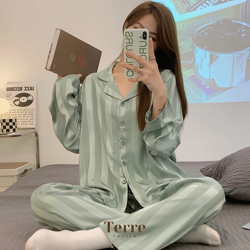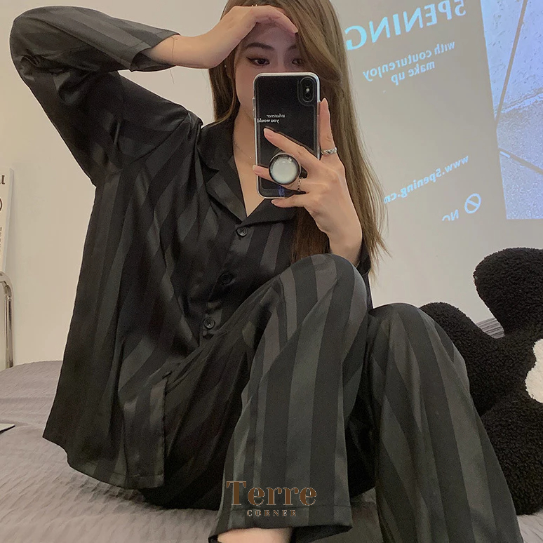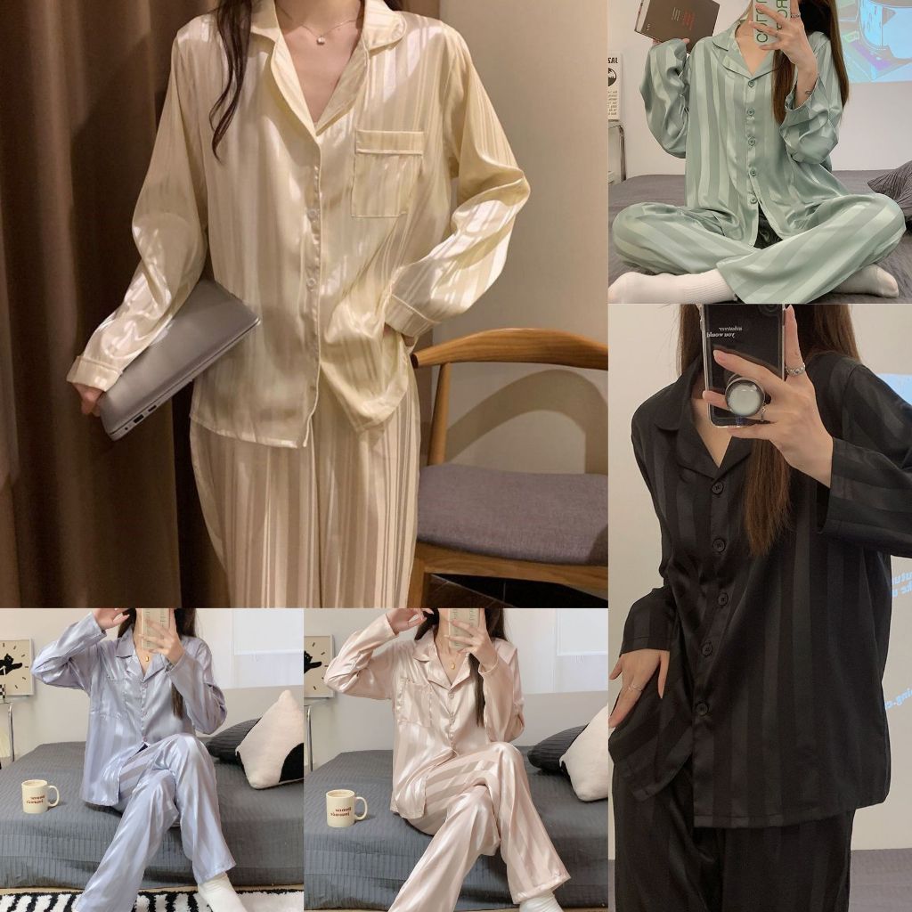 [RINGAN ADEM SERIES] BAJU TIDUR WANITA DEWASA KYARA LONG SLEEPWEAR PIYAMA SET SATIN SILK SETELAN GARIS WARNA POLOS PAKAI