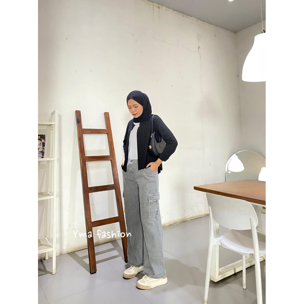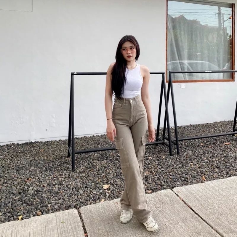 Yma Fashion - Celana Jeans Cargo Wanita - Hightwaist Celana Jeans Cargo