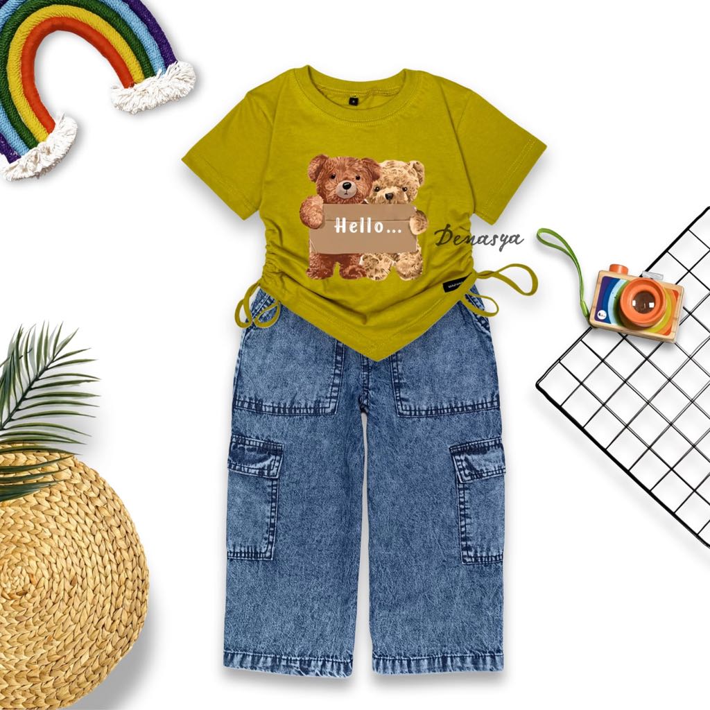 Setelan Anak Perempuan Kekinian One Set Kulot Cargo Jeans Kaos Serut Sablon Usia 2-12 Tahun