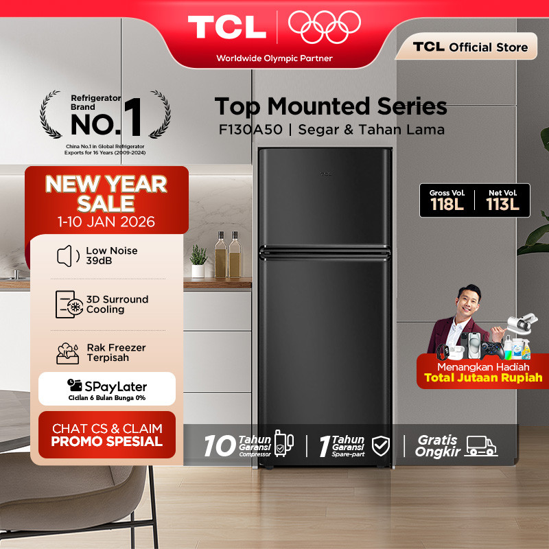 TCL Kulkas 2 Pintu (F130-A50) - Kapasitas 118L - Rak Freezer Terpisah - 3D Surround Cooling - Adjustable shelves - Low Noise 39dB - Metal Panel - Kulkas Mini - Lemari Es - Kulkas Kecil Kamar