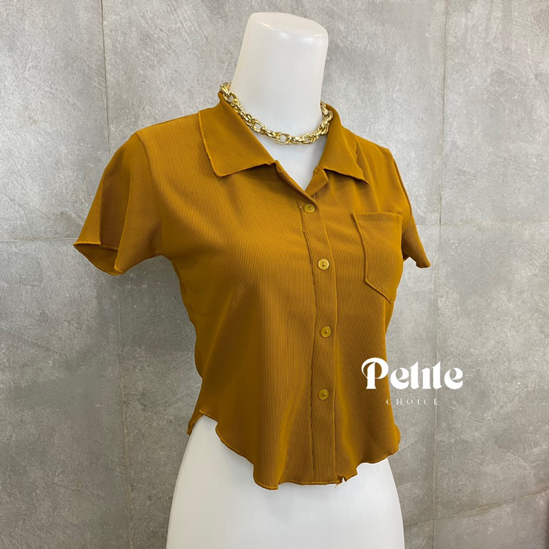 Atasan Crop Wanita Petitechoice Collin Top Berkerah Knit Stretch Kancing Casual Korean Comfy