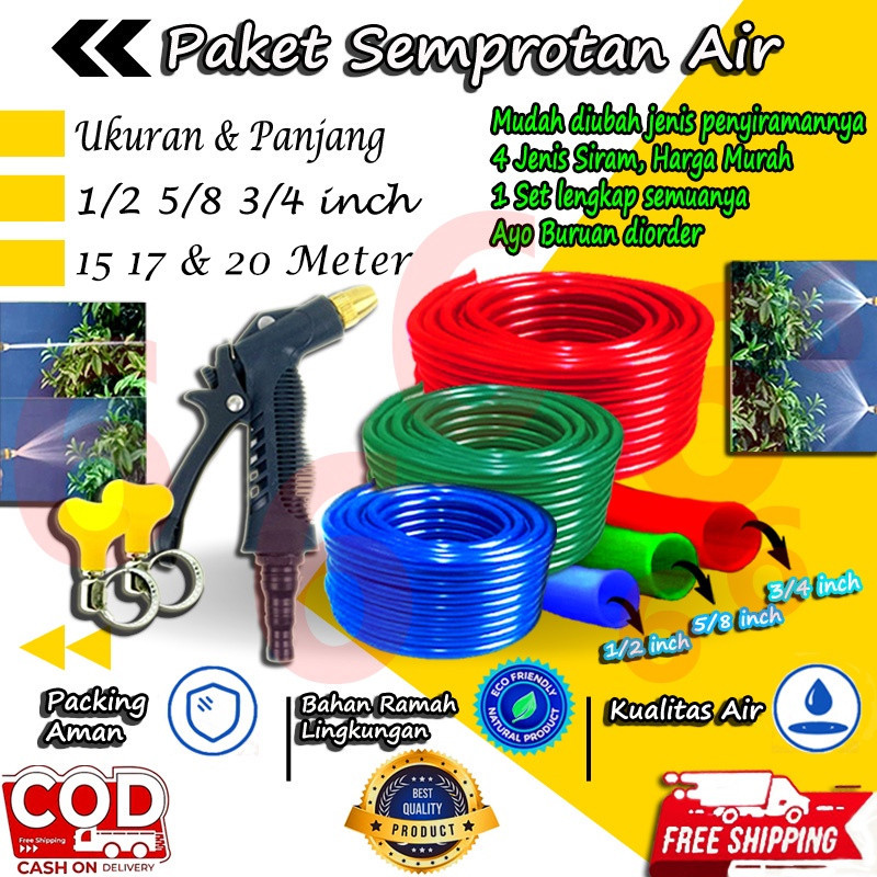 Paket Semprotan Selang Air Elastis Dop 1/2 5/8 3/4 15, 17 & 20 Meter Selang Taman Cuci Motor Mobil