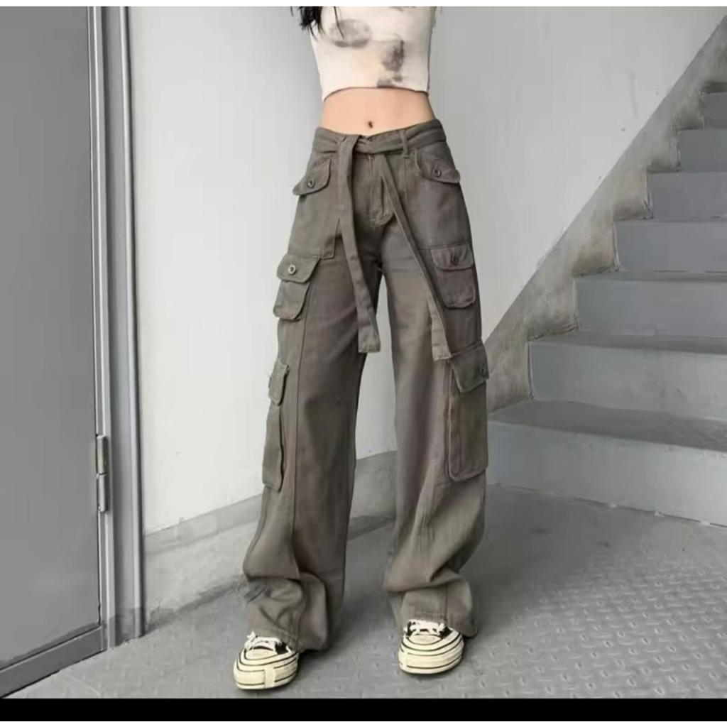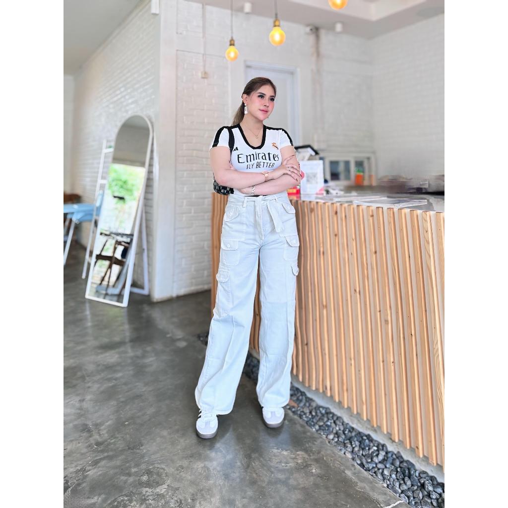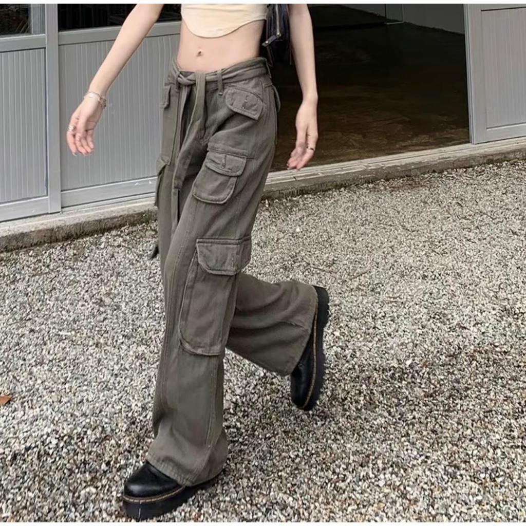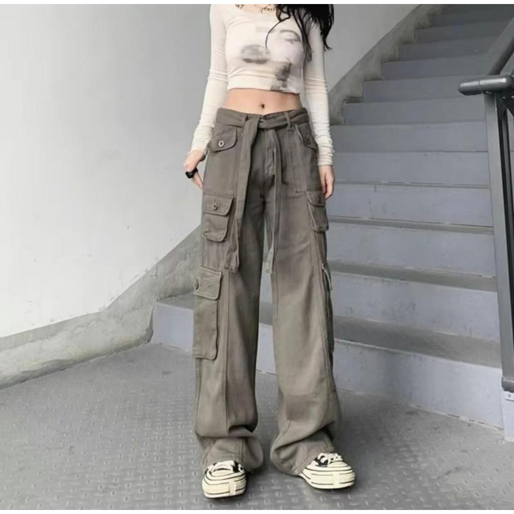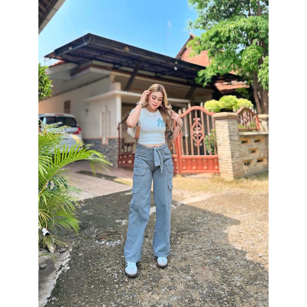 cargo jeans korean tali unisex celana jeans higwaist cargo tali panjang