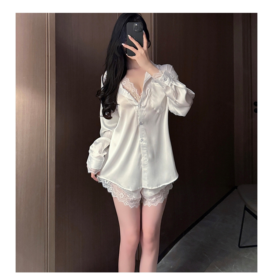 Kemeja Lengan Panjang Wanita Baju Tidur KMJ-9687 Piyama Set Celana Pendek Renda Lace HEBAT FYP PRIMIUN QUALITY