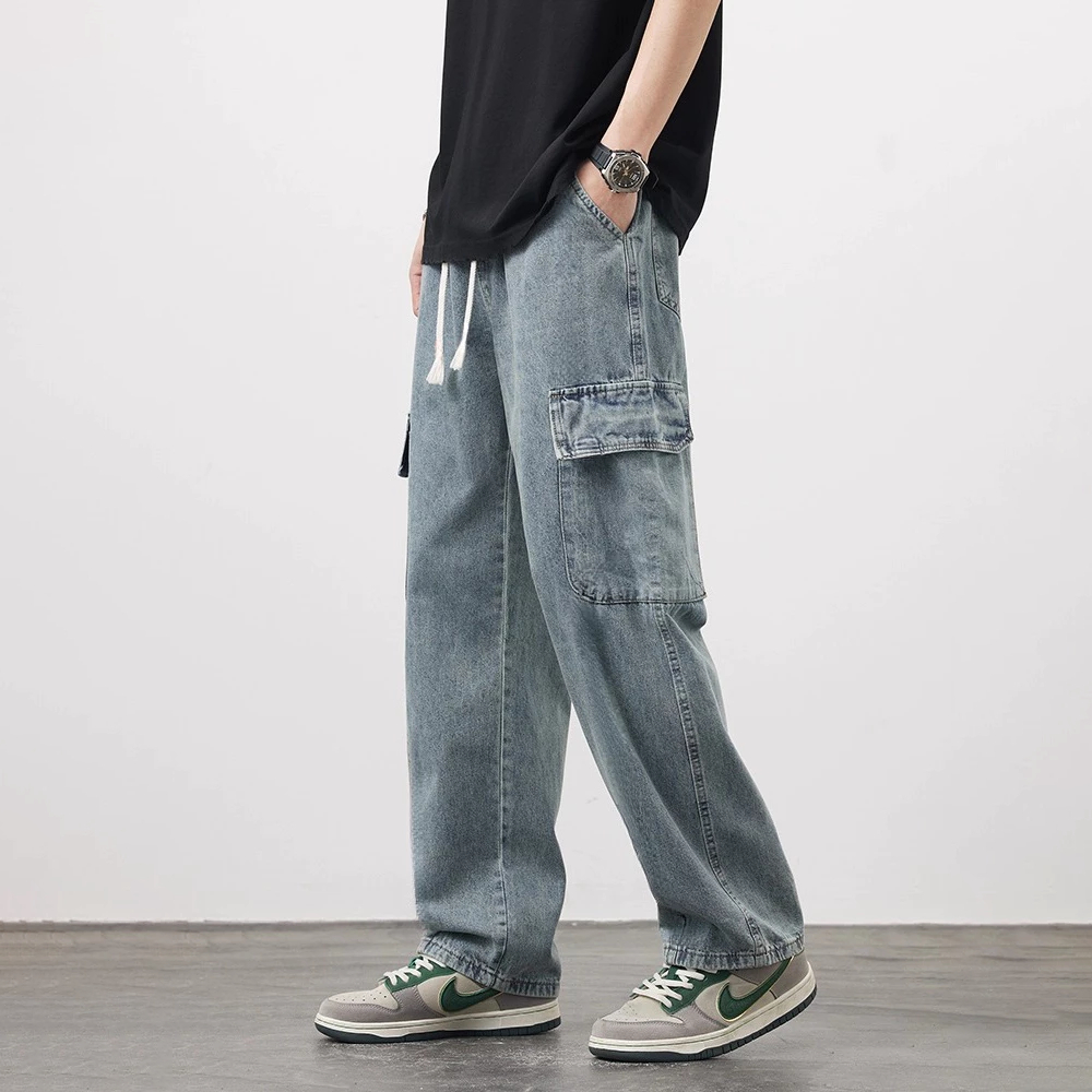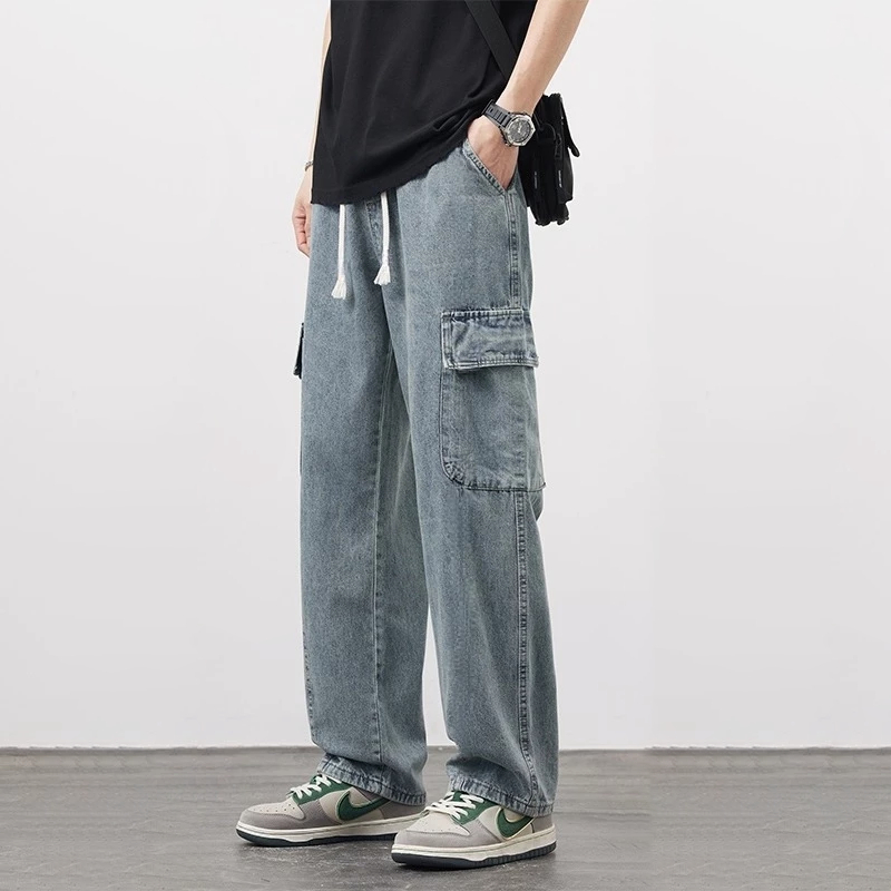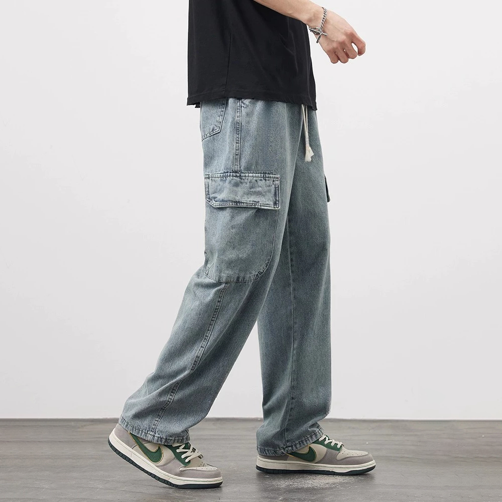 Dinn Celana Cargo Panjang Pria longgar Denim Korean Street Style Terbaru Cowok Dewasa Loose Fit Celana Jeans Pria Casual Nyaman Pinggang Elastis
