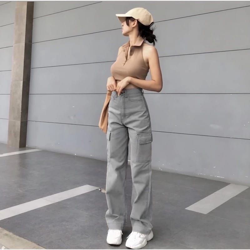 HIGHWAIST CARGO JEANS WANITA - CELANA JEANS WANITA HIGHWAIST