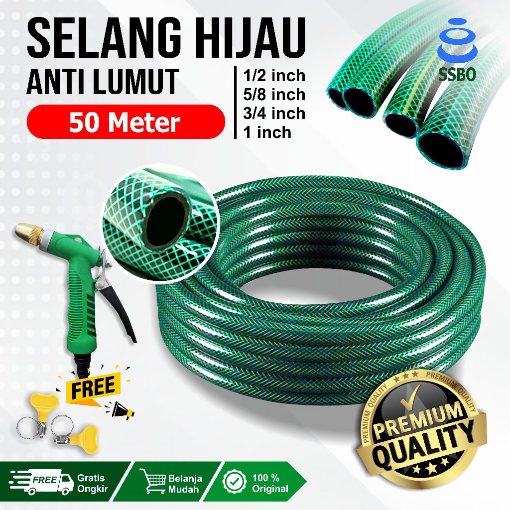 Ssbo Selang Air 1 Rol 50 Meter Selang Air Hijau Anti Lumut 1/2 5/8 3/4 1 Inch Selang Air Taman Kebun