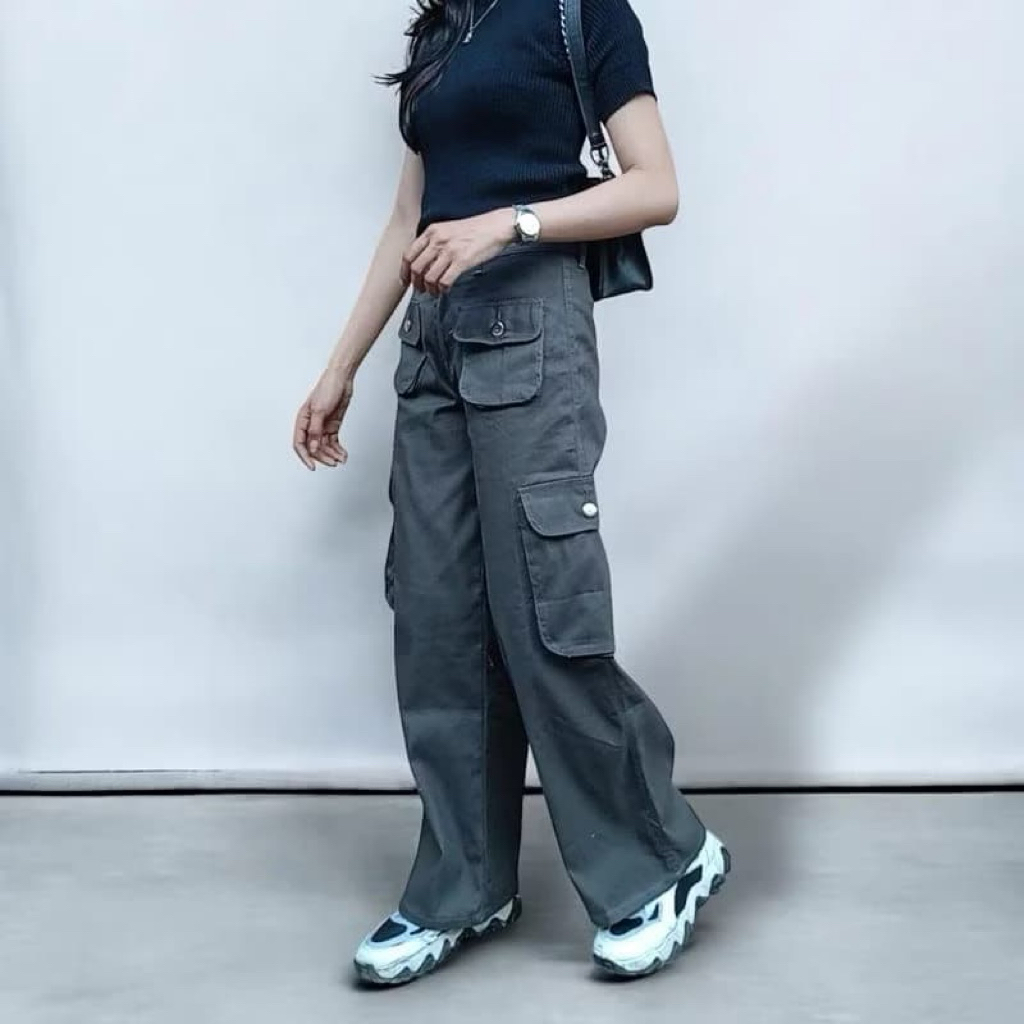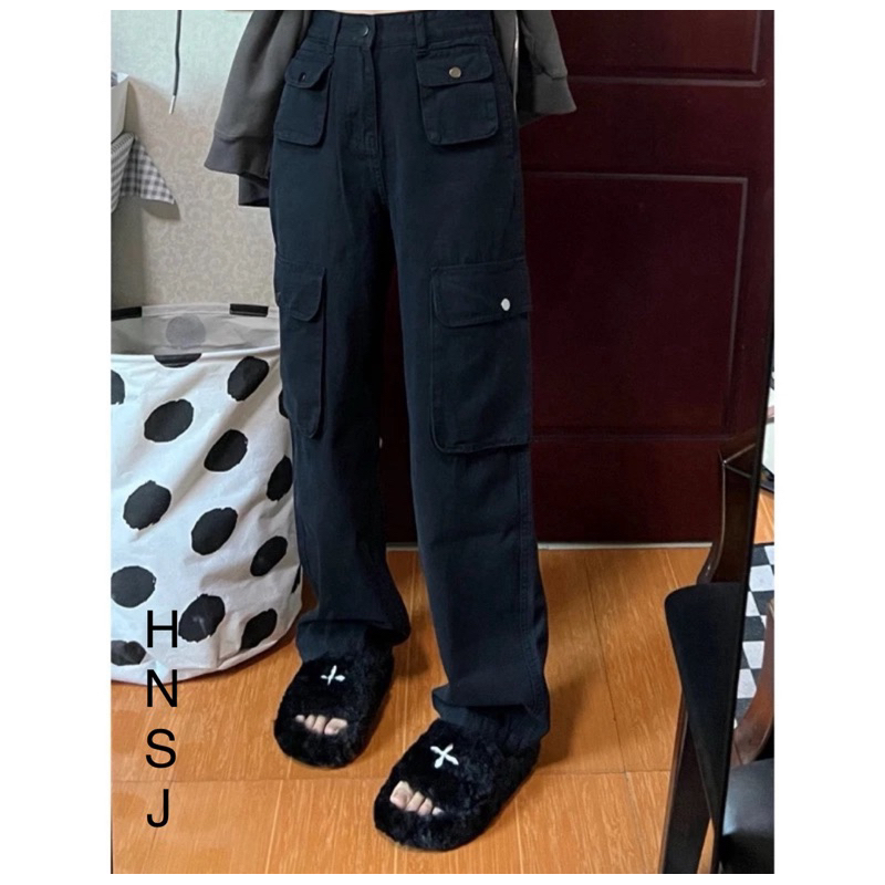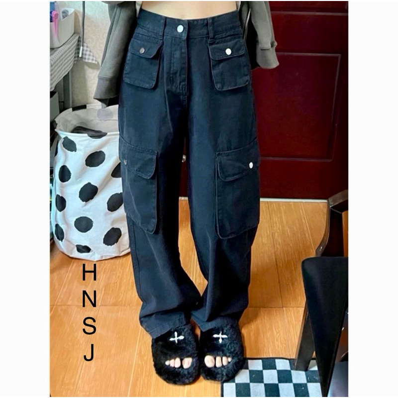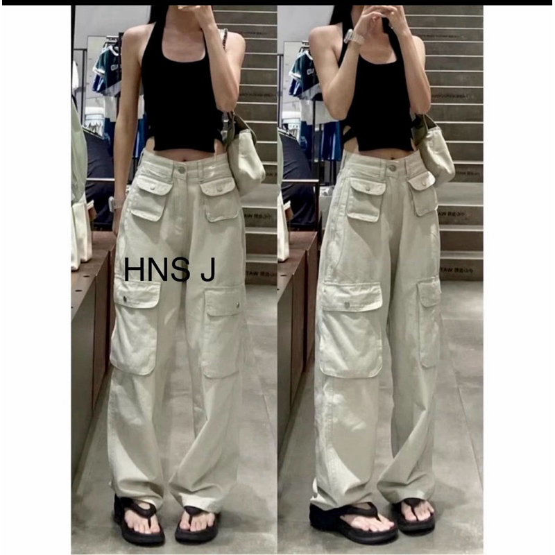 HnSJeans/-Cargo denim Highwaist pasir putih Losee celana Jeans Wanita Korean