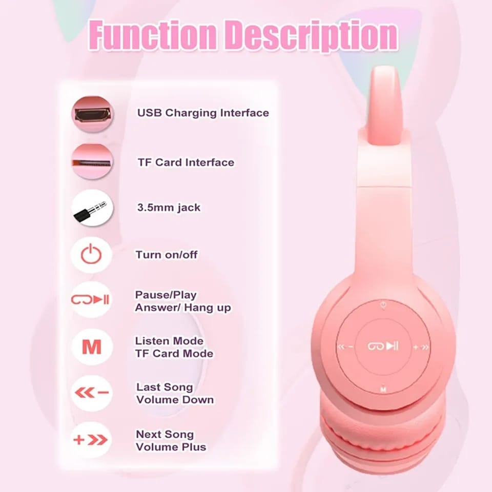 P47M Headphone Bluetooth Gaming Cat Ears Wireless RGB LED Light Super Bass Stereo Headset Bando