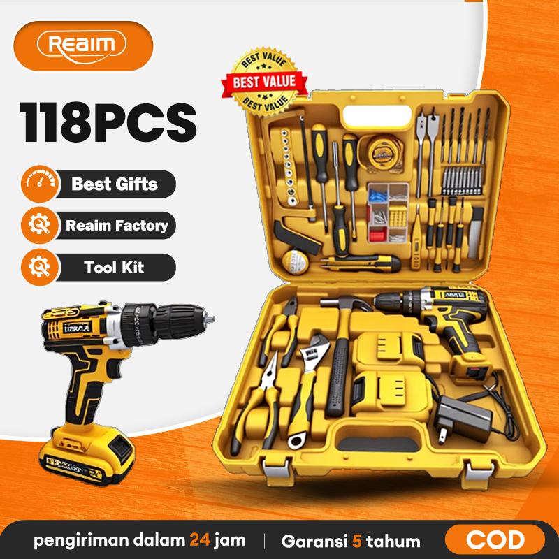 Reaim Set Alat 118 Pcs - Set Kunci Pas Anti Guncangan, Kunci Sok, Obeng Multi-Fungsi untuk Mobil, Serta Kunci Torsi dan