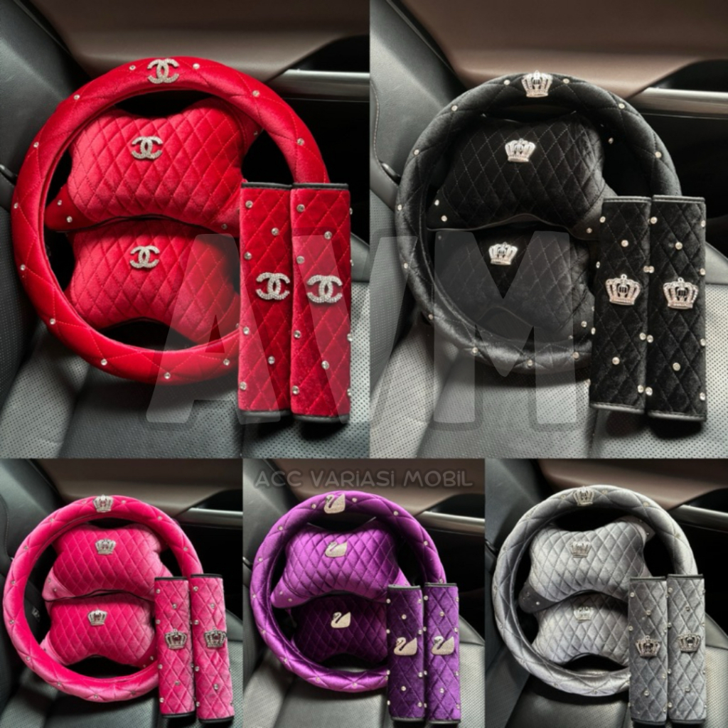 [SET LOGO BLUDRU 3IN1] Paket PREMIUM Interior Mobil Diamond Bahan BLUDRU / Cover Sarung Setir, Safetybelt, Headrest (Crown / Swan / CN)