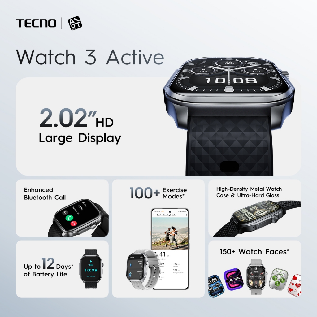 TECNO Watch 3 Active - Enhanced Bluetooth Call | 2.02"" HD Large Display | Up to 12 Days of Battery Life