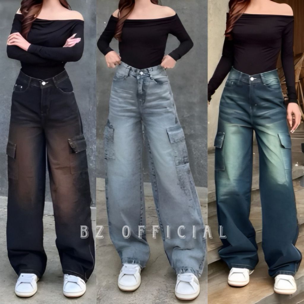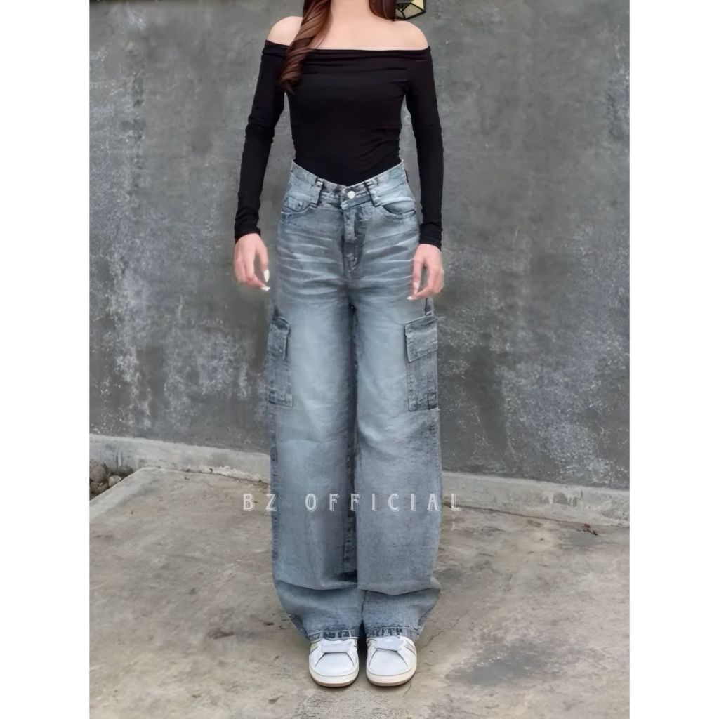 Celana Cargo Whisker Wanita – Jeans Highwaist Baggy Loose Fit Kekinian