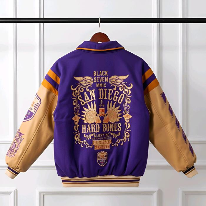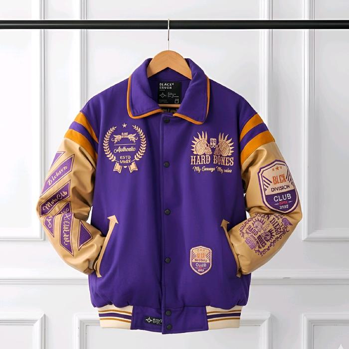 VARSITY JACKET SAN DIEGO HARD BONES PURPLE CREAM JAKET BASEBALL KERAH BORDIR ORIGINAL UNISEX Nyaman