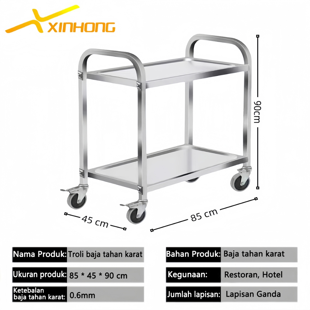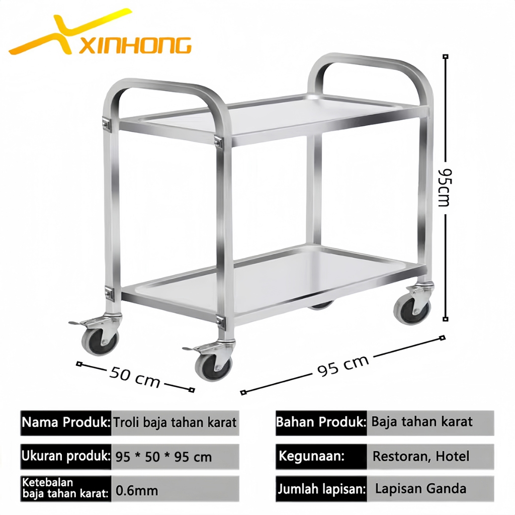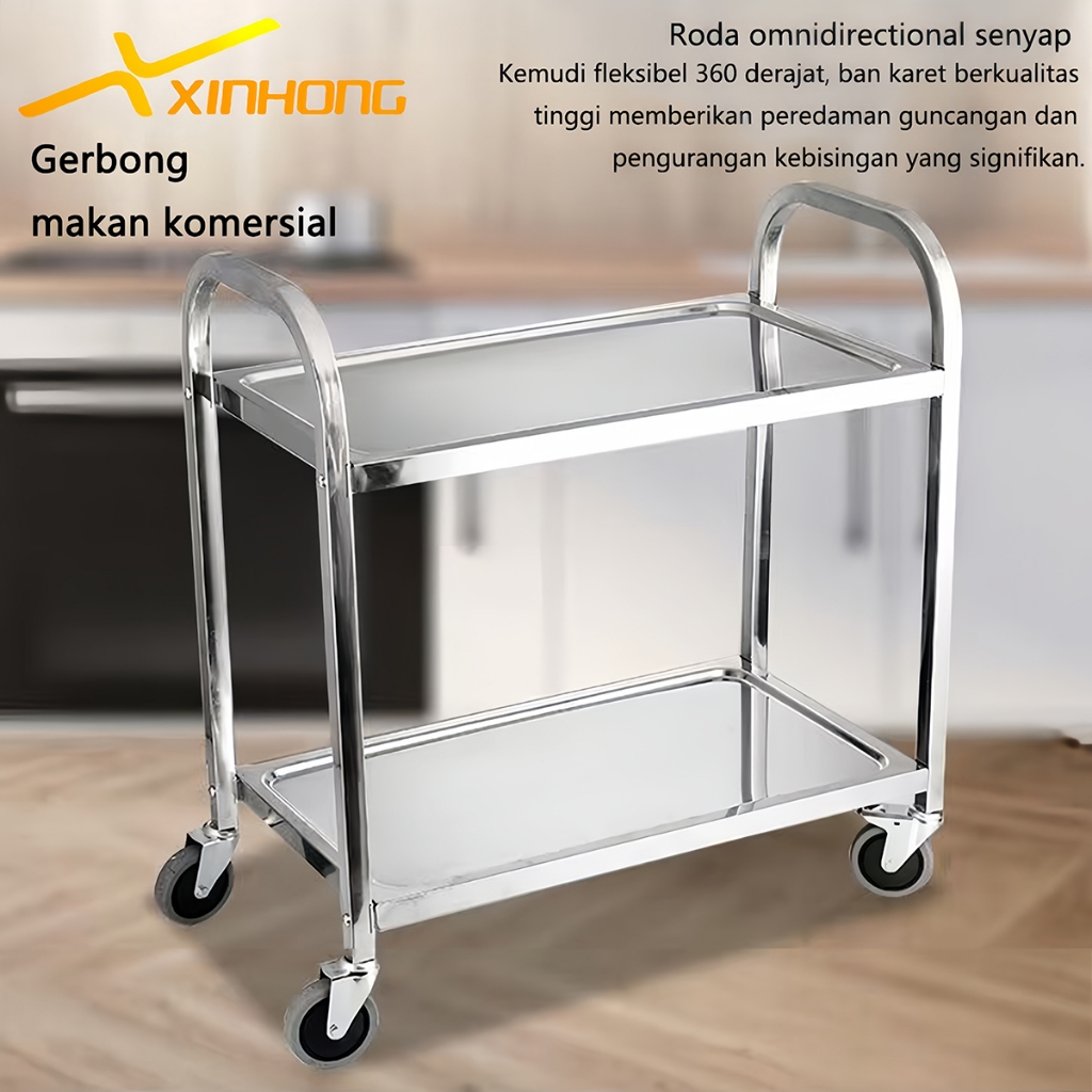 Xinhong Troli Hidangan 2 Tingkat Pipa Bulat Stainless Baja tahan karat 95X50X95cm Perak Trolly Makan