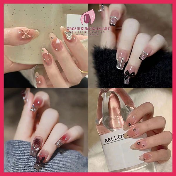 Kuku Palsu 3D Instant Isi 24 Pcs Motif Berlian Panjang Pendek Fake Nail Art Free Dengan Lem