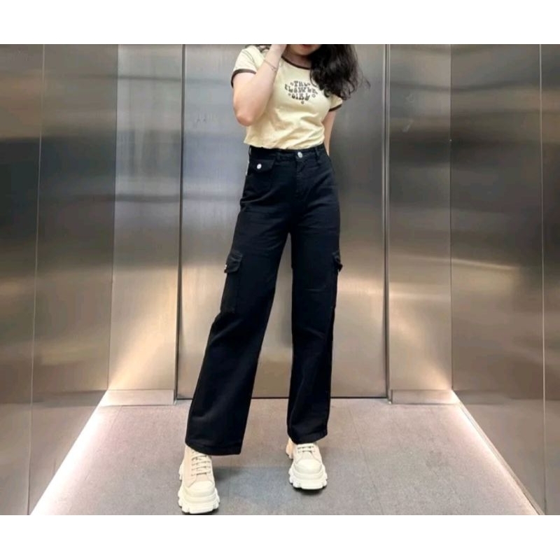 CELANA HIGHWAIST CARGO JEANS WANITA VOLL 2 PREMIUM ABU-ABU