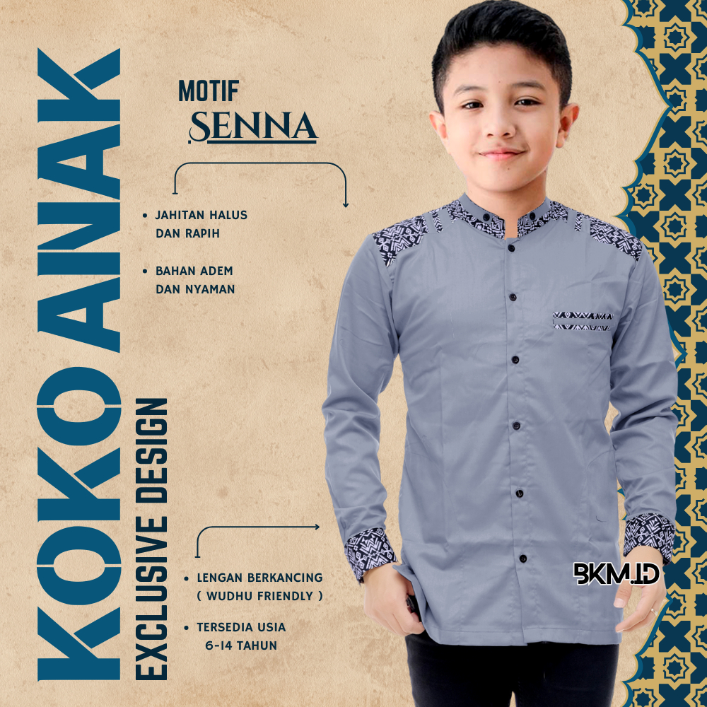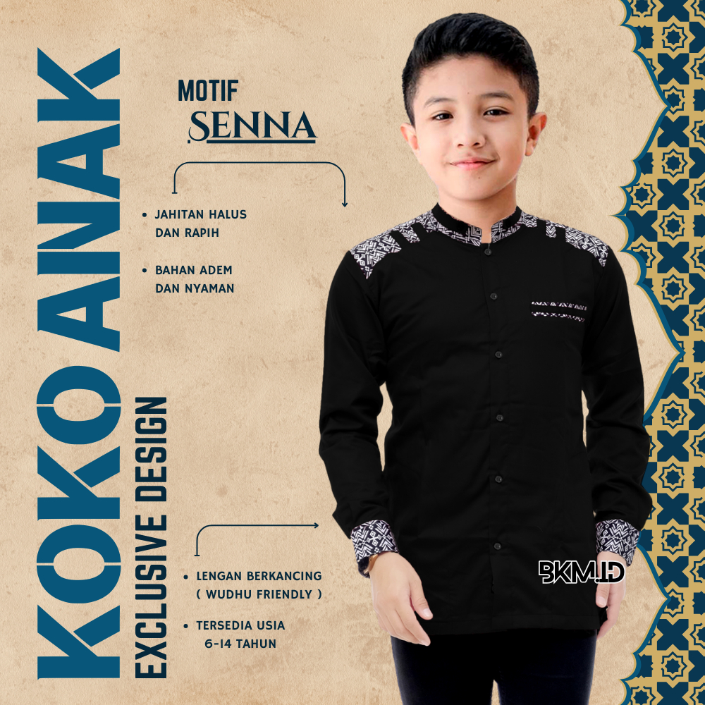 Baju Koko Anak Laki Laki-Lengan Panjang Motif Senna Batik 5-14 Tahun Warna Hitam Bahan Katun Viper