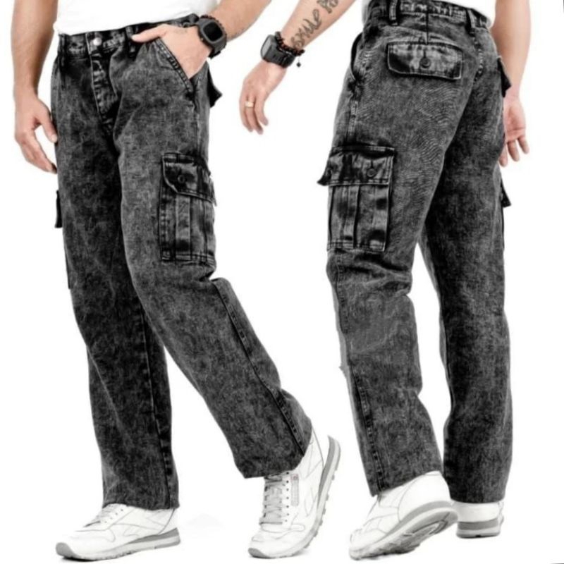 EX ZANO Long Cargo pants jeans Celana cargo jeans loose fit Reguler Standard Black Sandwash