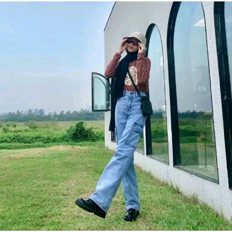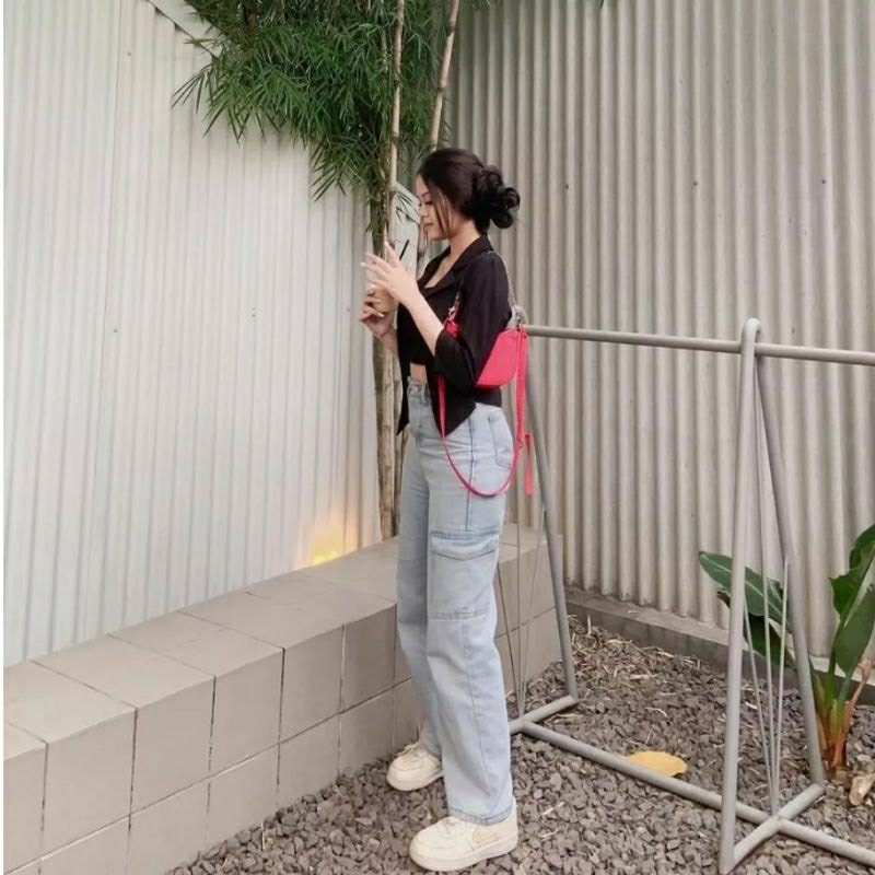 CELANA HIGHWAIST CARGO JEANS WANITA LOSE LIGH PREMIUM