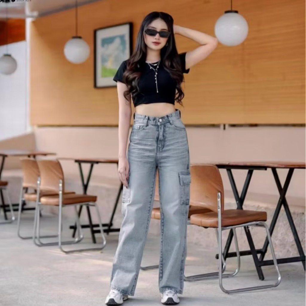 Highwaist Cargo Jeans Wanita Korean Style Terbaru Kekinian | Highwaist Baggy Cargo Jeans Retro Whisker