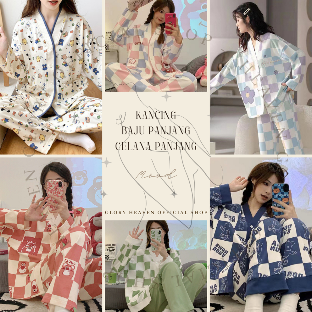 Baju Tidur Wanita Glory Lengan Pendek Panjang Kancing Piyama Korea Busui Import